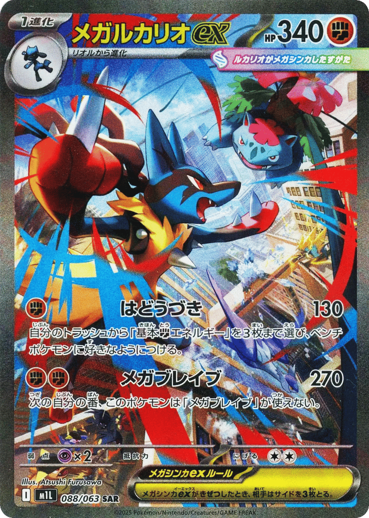 Types: FightingHP: 340Rarity: Special Art RareArtist: Atsushi FurusawaSet: Mega BraveCard Number: 088/063/63Japanese Name: Mega Lucario ex