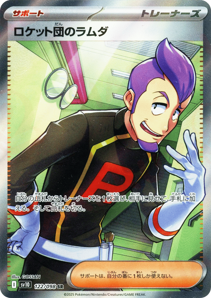 Rarity: Super RareArtist: GOSSANSet: Glory of Team RocketCard Number: 122/098/98Japanese Name: ロケット団のラムダ